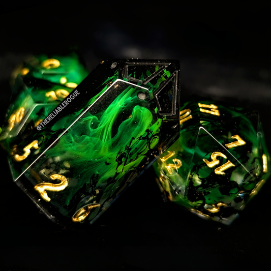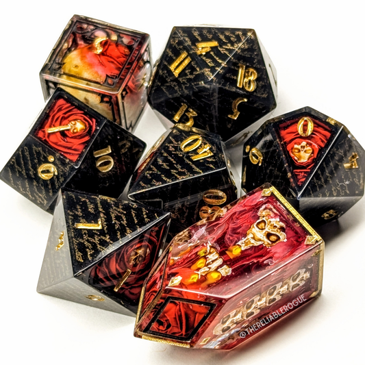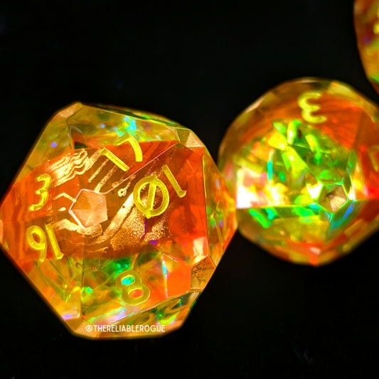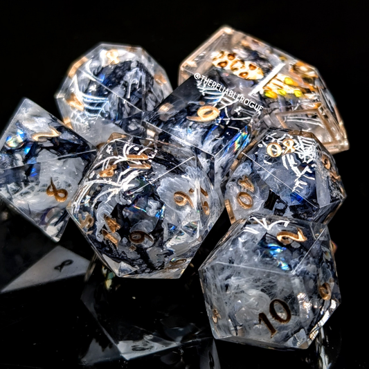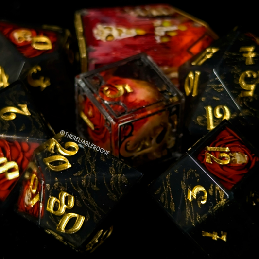pictures can't do these justice. this was my first order from the Reliable Rogue and... wow?? I've bought a lot of dice over the years, but there's something truly so special about these. the art is stunning. the dice themselves look like they should be on display, they're gorgeous, and I can't wait to add more to my collection ☺️ also?? my order was shipped SO quickly and arrived in a matter of days. they were packaged exceptionally well; a lot of care went into this in so many ways, from conception to execution to delivery. thank you!!