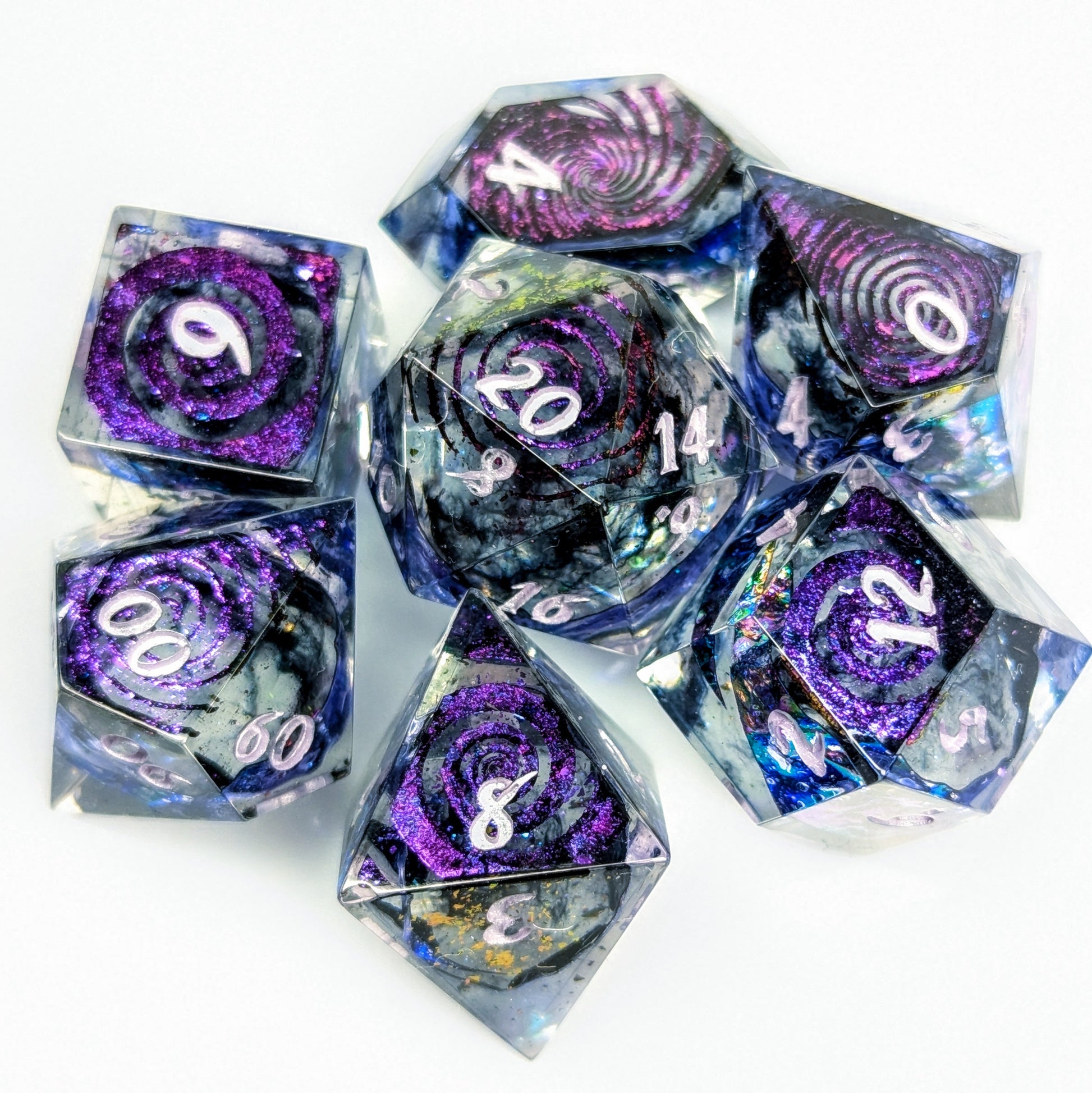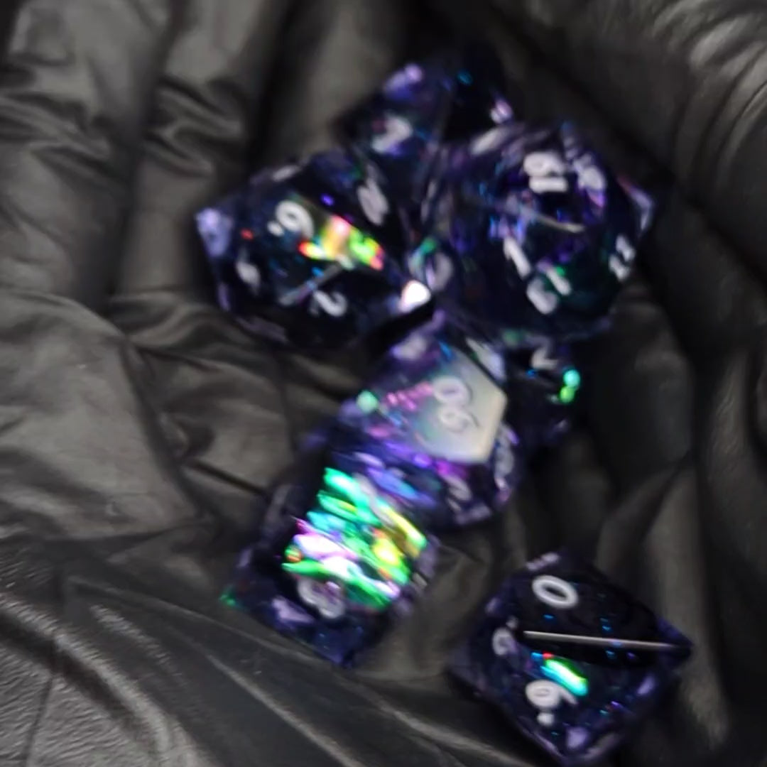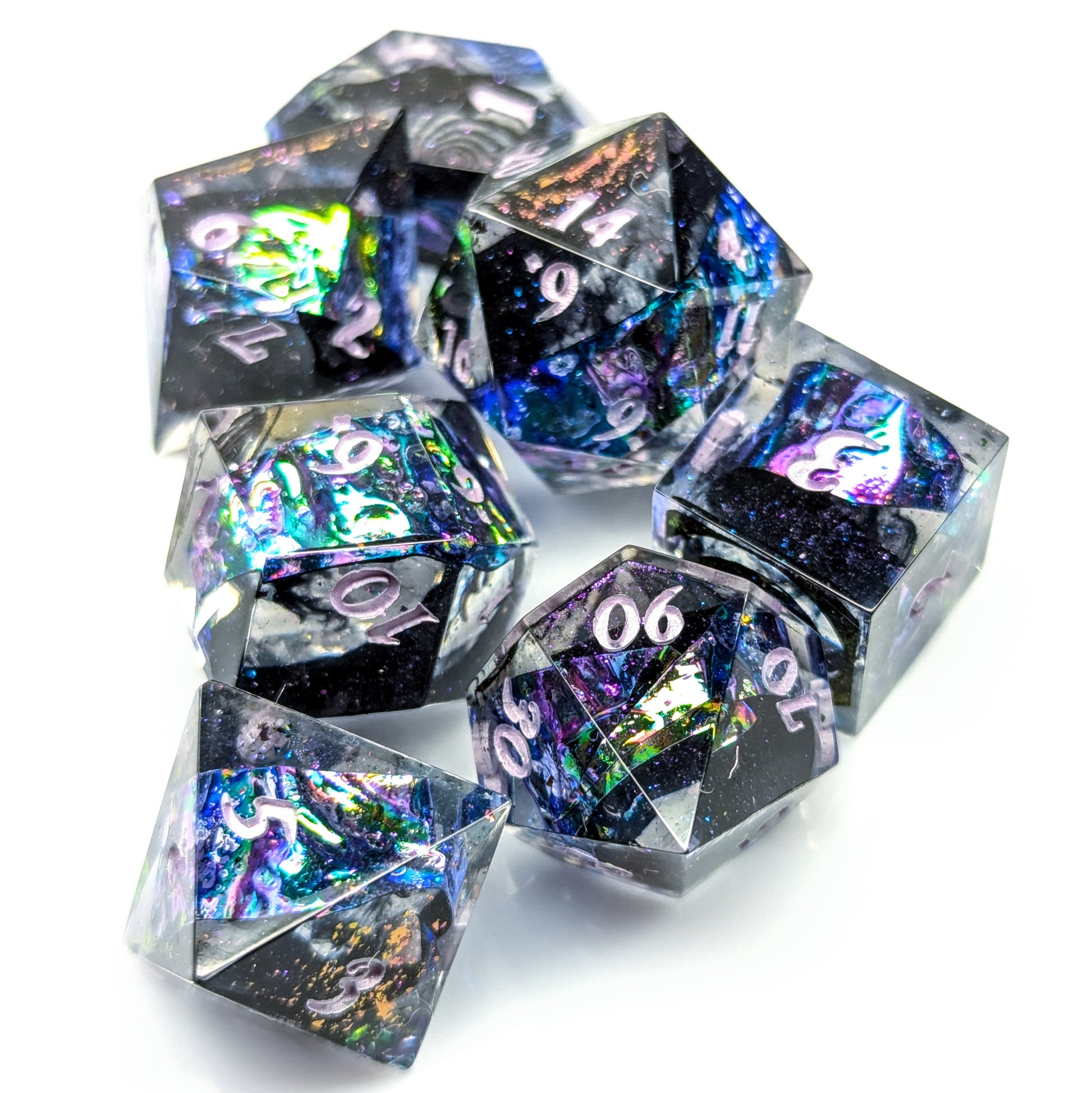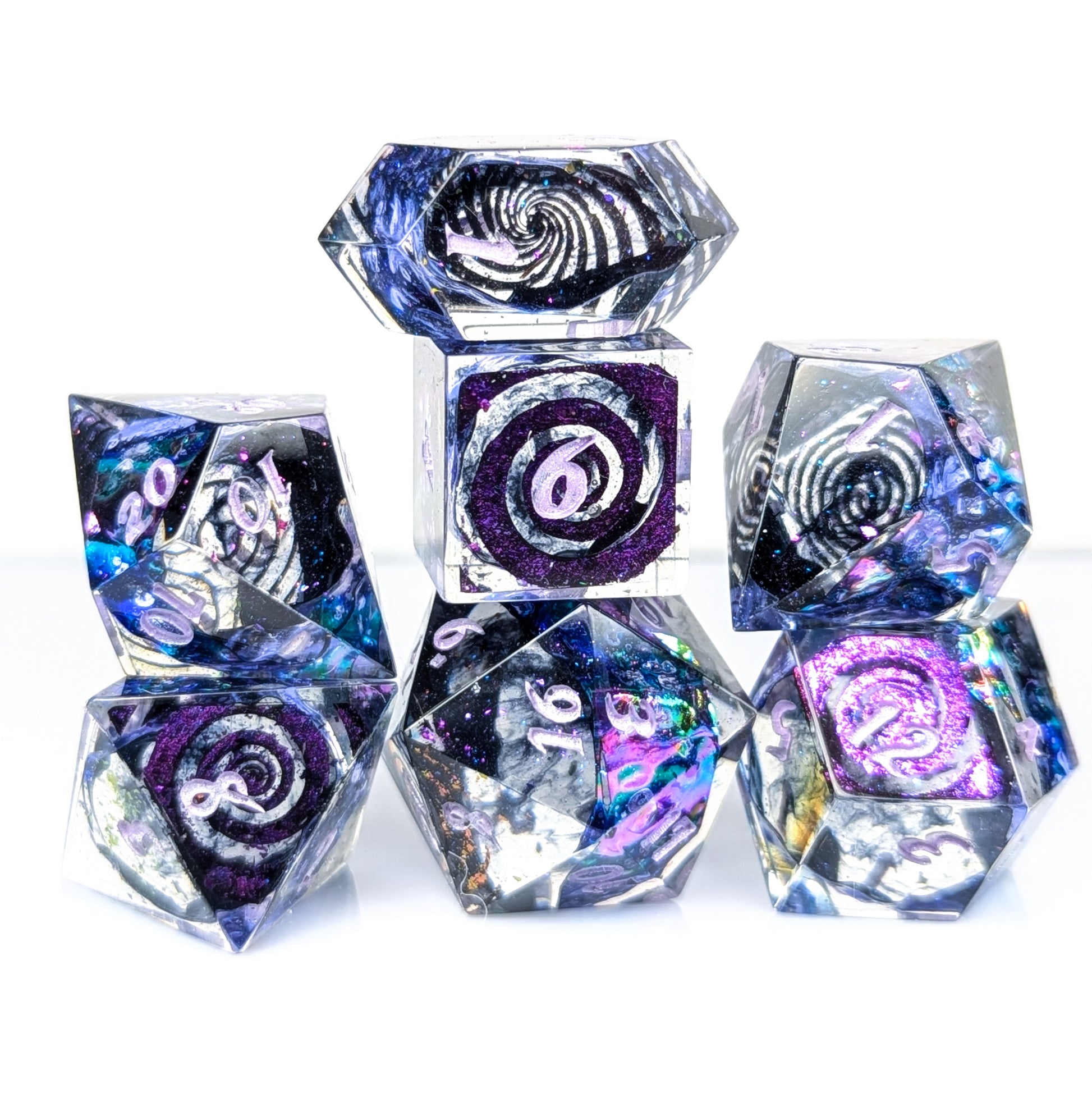 A gorgeous strip of oil slick colored cellophane sits in clear resin with black inky tendrils in the center. The high face of each die features a variety of color shifting swirly patterns. They are finished with metallic lilac numbers.