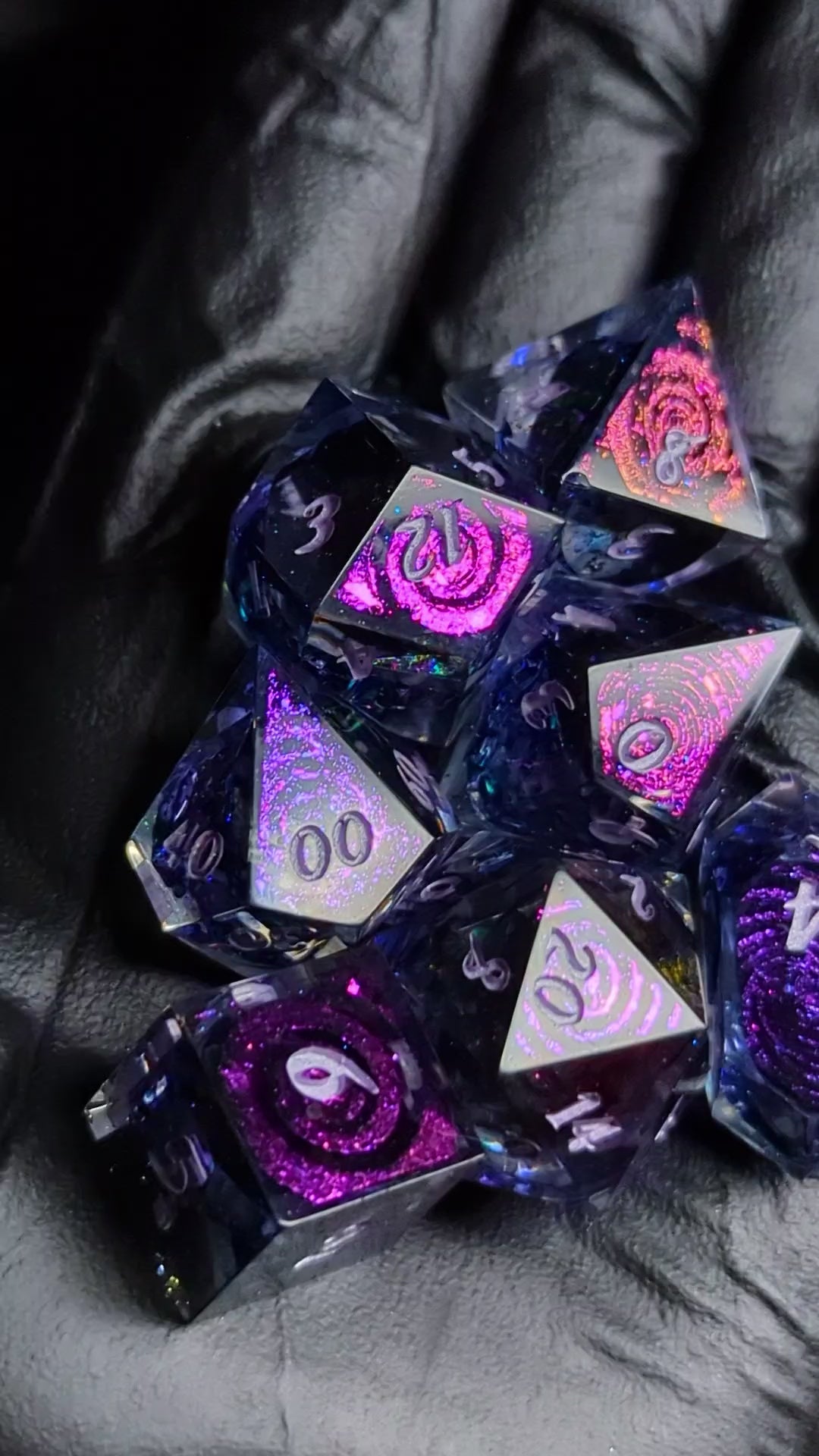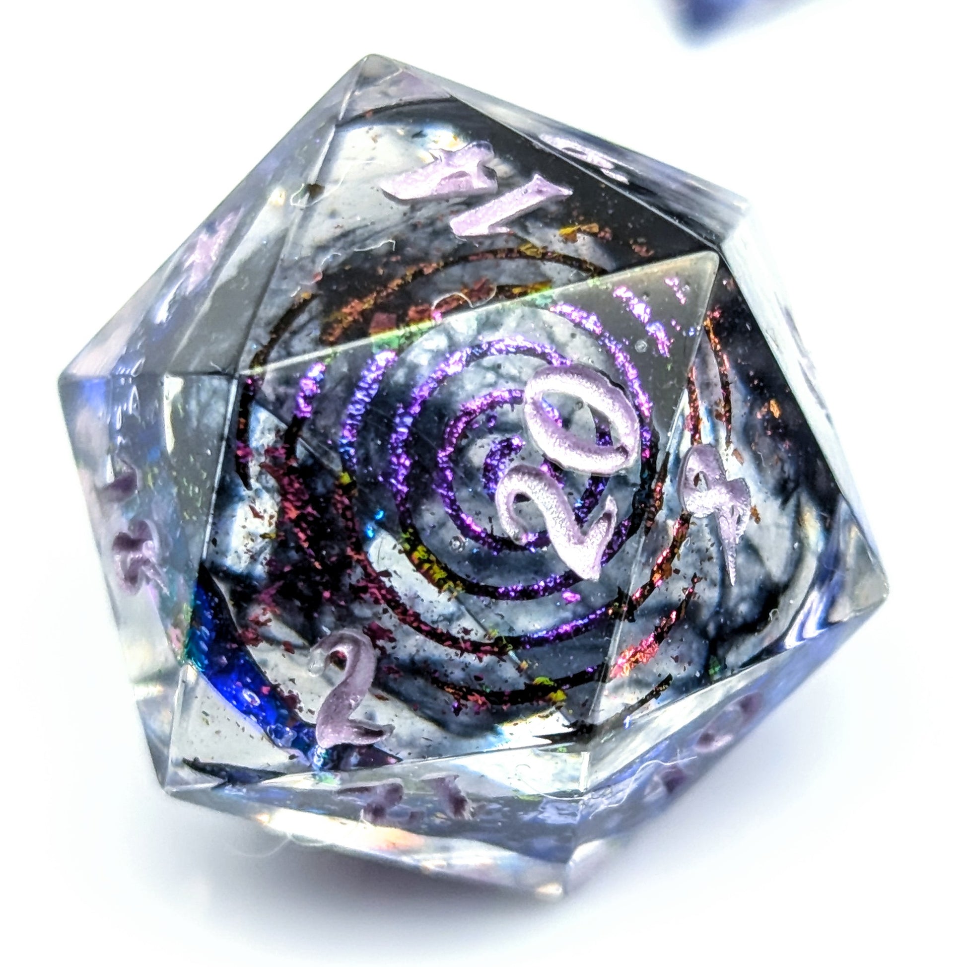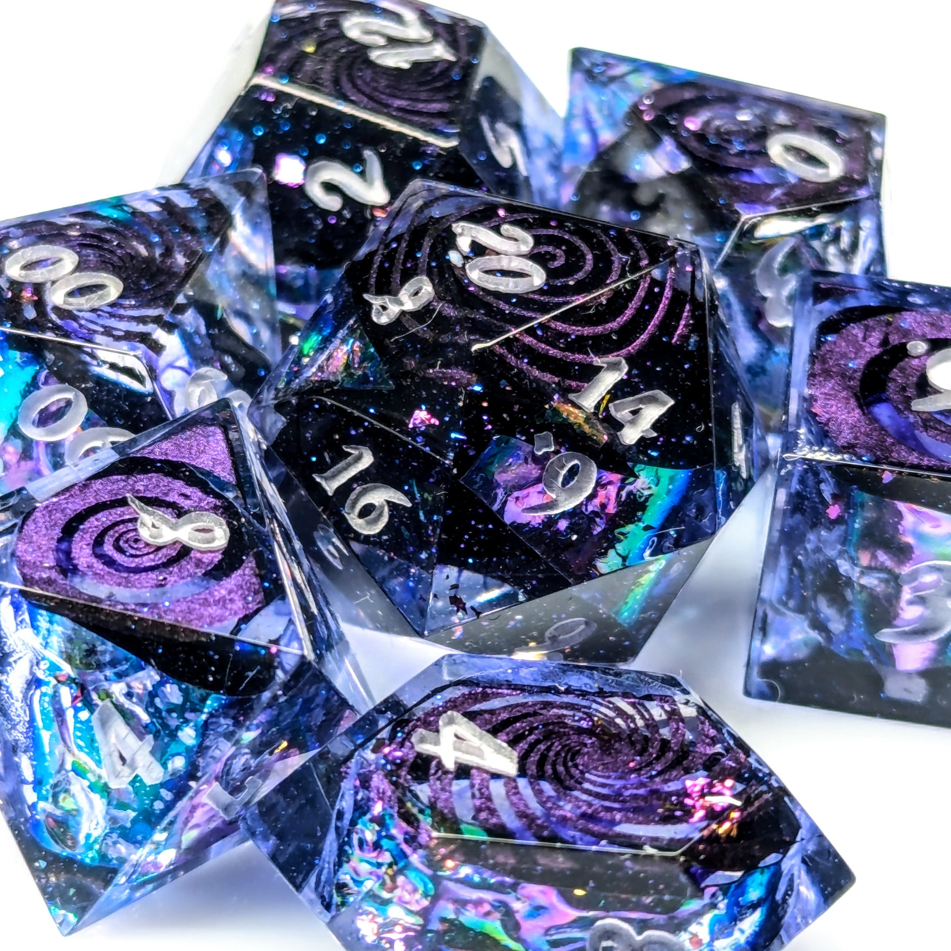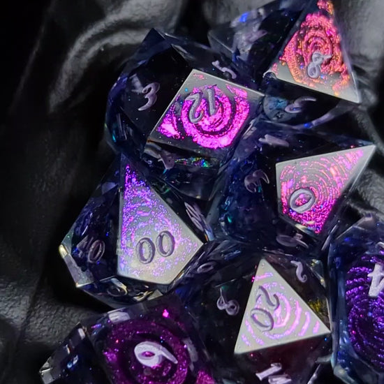 A gorgeous strip of oil slick colored cellophane sits in clear resin with black inky tendrils in the center. The high face of each die features a variety of color shifting swirly patterns. They are finished with metallic lilac numbers.