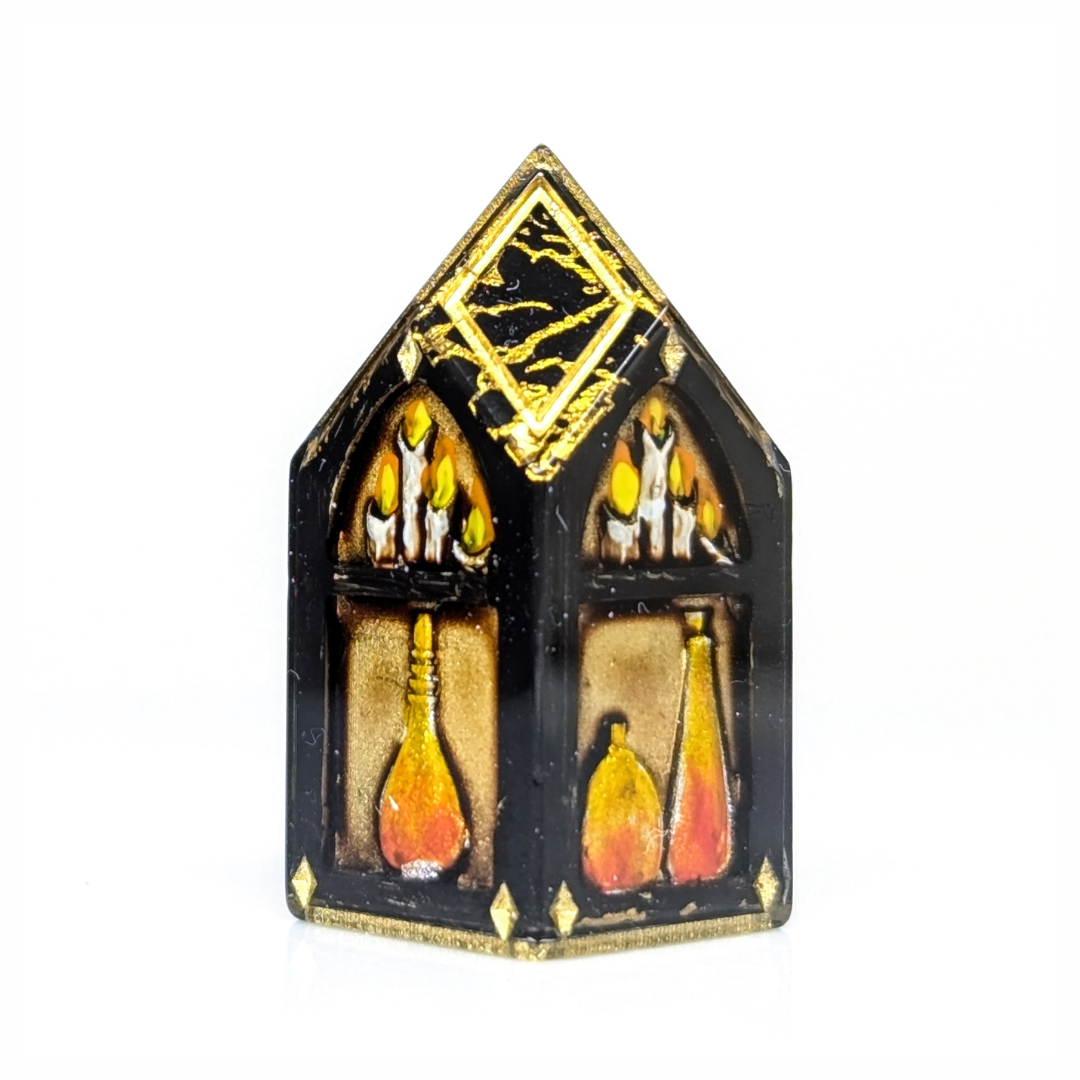 This bas relief style d4 features raised elements immersing you in a scene across its entirety. Each insert is printed and hand painted by me. Then a second cast is done to encase these inserts in resin and ensure the colors and paints will not fade or chip.