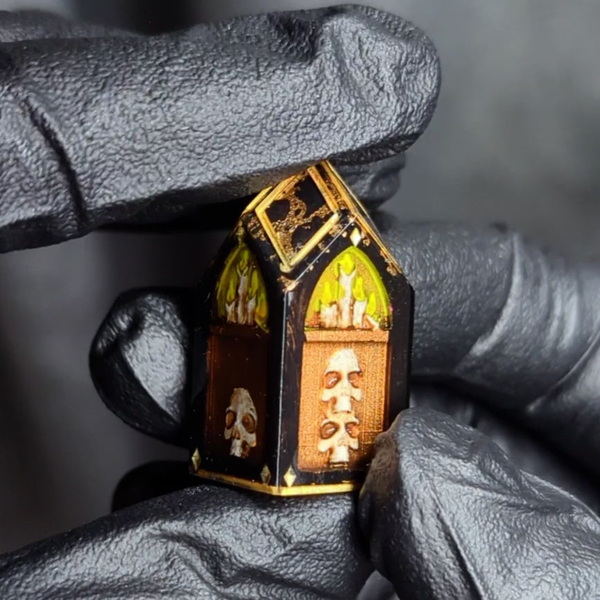 This bas relief style d4 features raised elements immersing you in a scene across its entirety. Each insert is printed and hand painted by me. Then a second cast is done to encase these inserts in resin and ensure the colors and paints will not fade or chip.