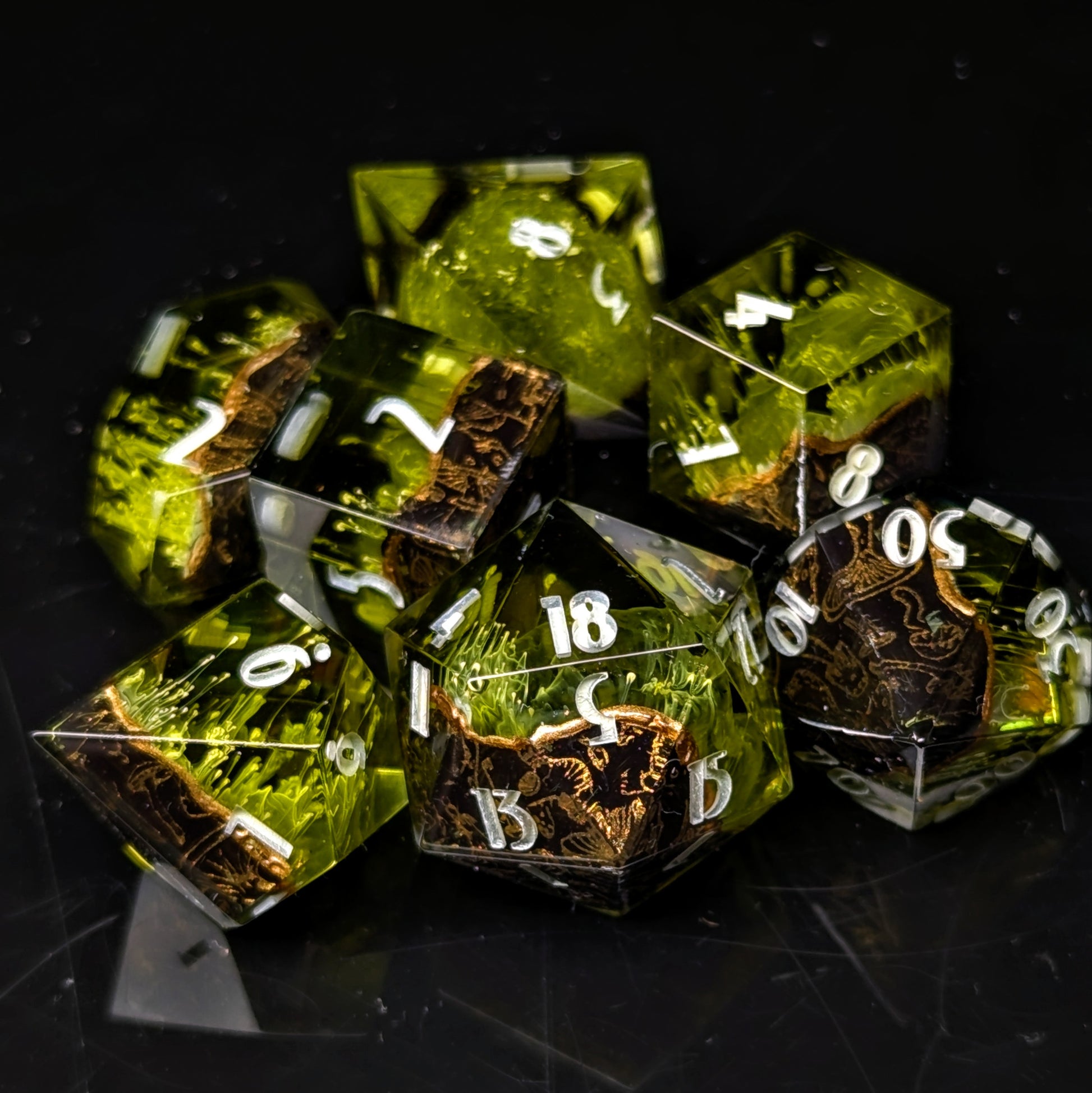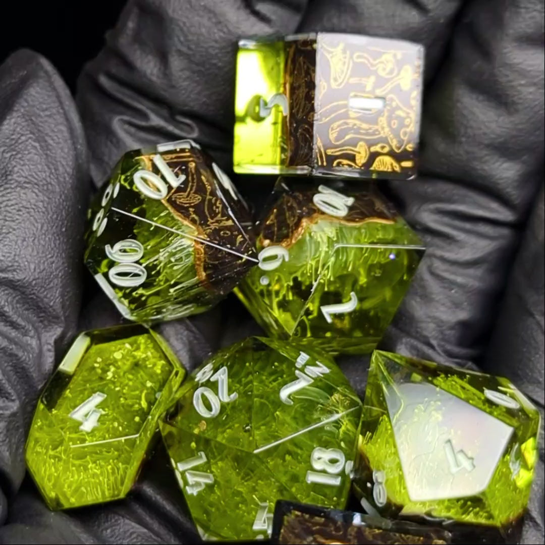 Dark green and white petri is capped with a black and gold mushroom pattern. They are finished with light green numbers.