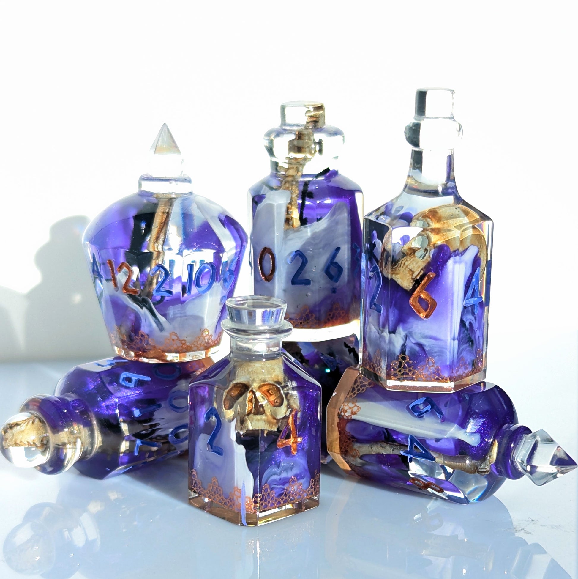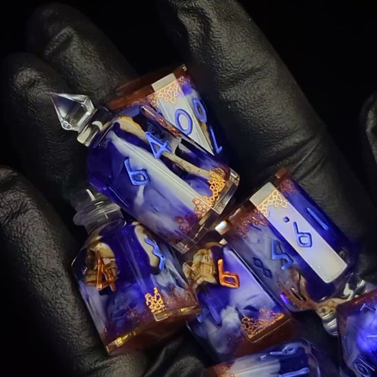 These large potion shaped dice will add something special to your collection. the sizes range between 32mm - 45mm. Each shape is unique from the rest but all come together to make a unique and unforgettable set!