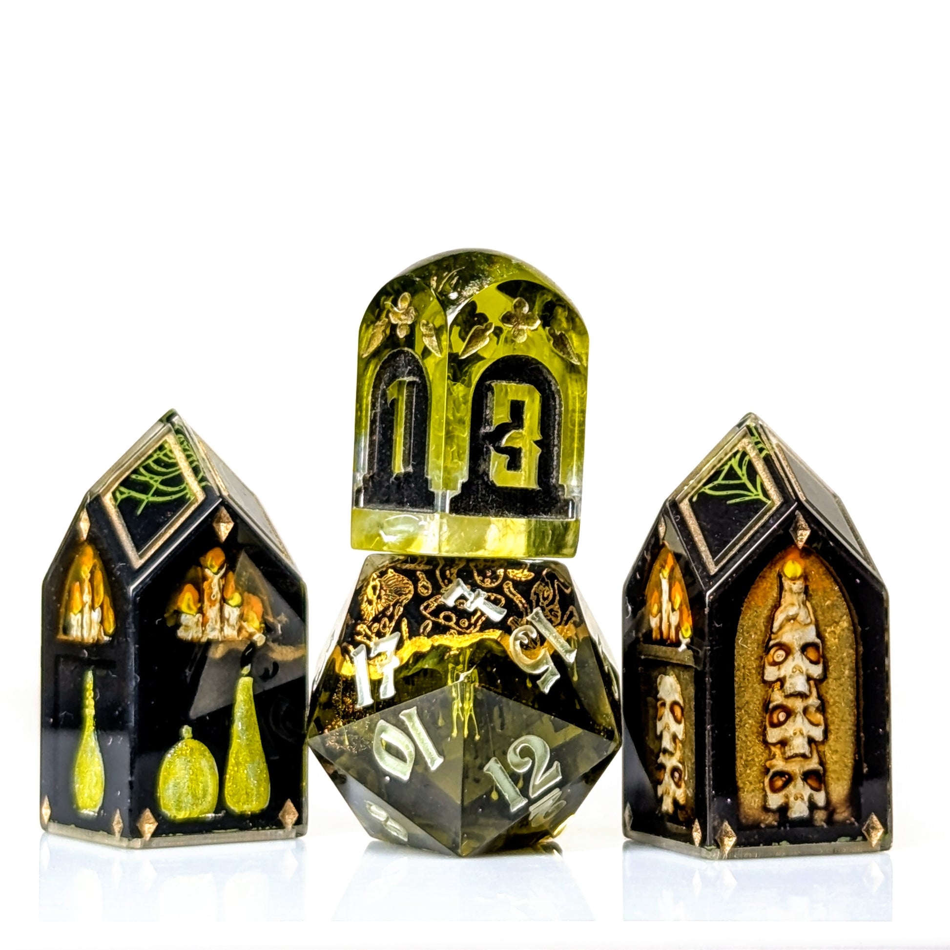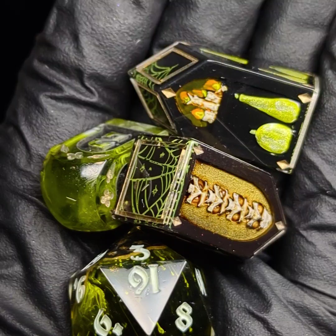 A small mismatched set featuring hand painted 3d4 and 1d20 made around a poison theme.