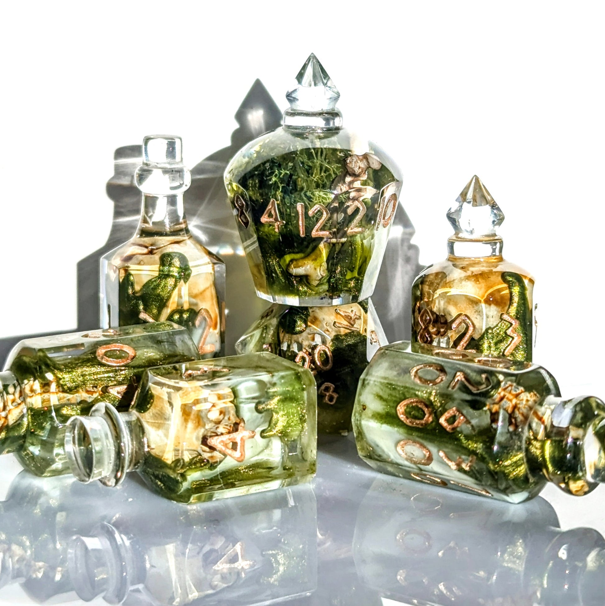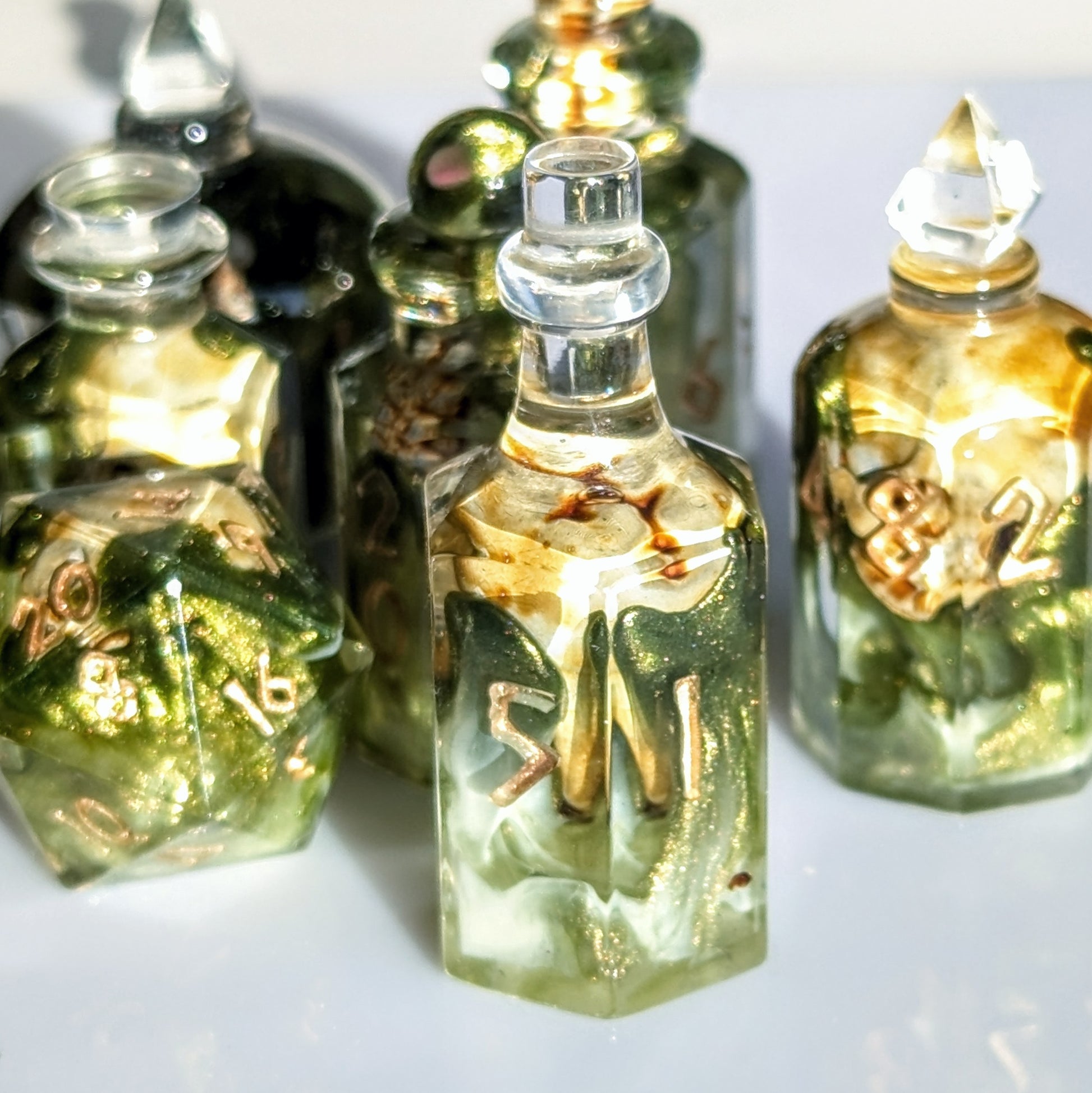 These large potion shaped dice will add something special to your collection. the sizes range between 32mm - 45mm. Each shape is unique from the rest but all come together to make a unique and unforgettable set!