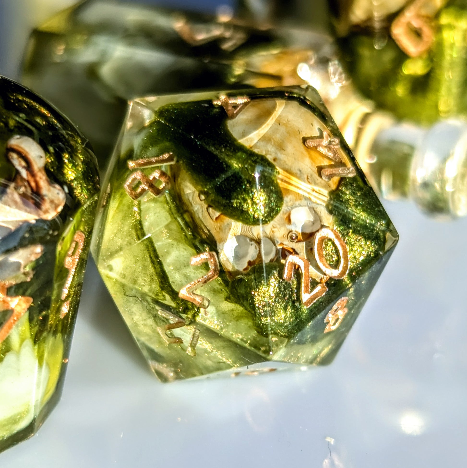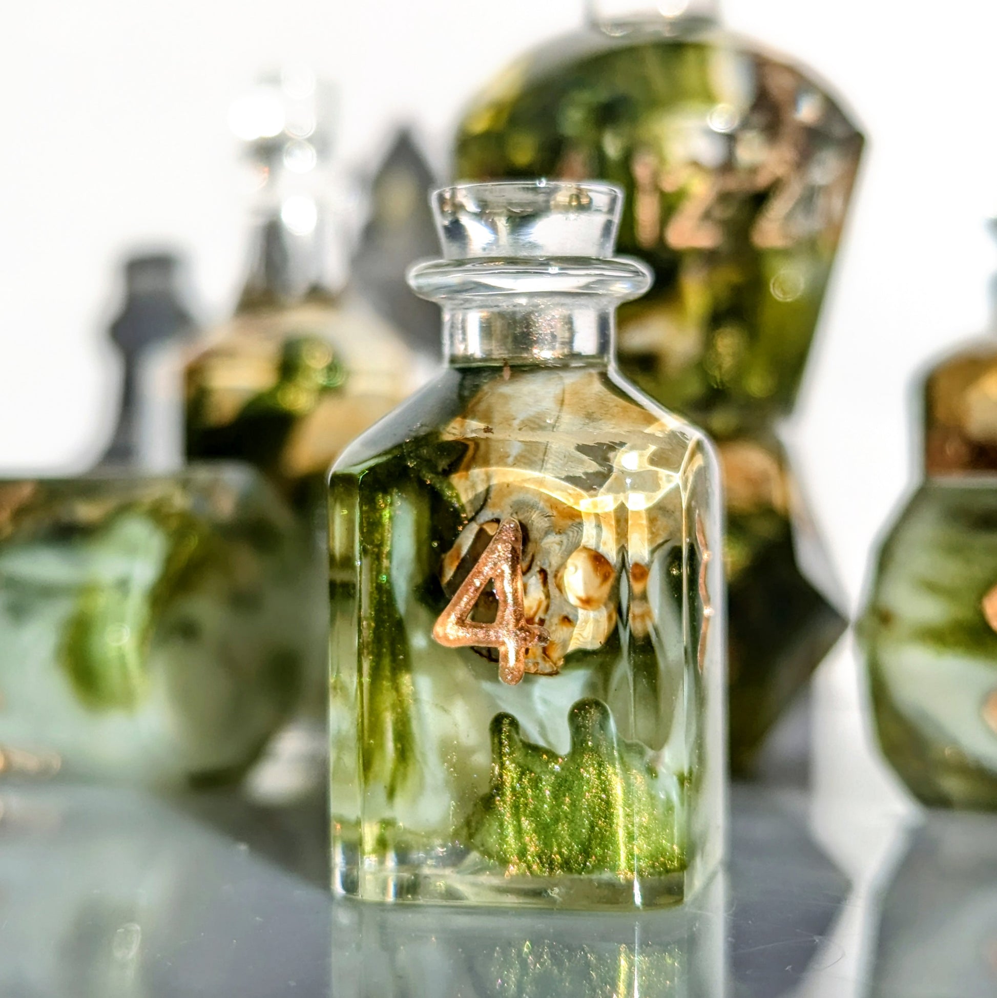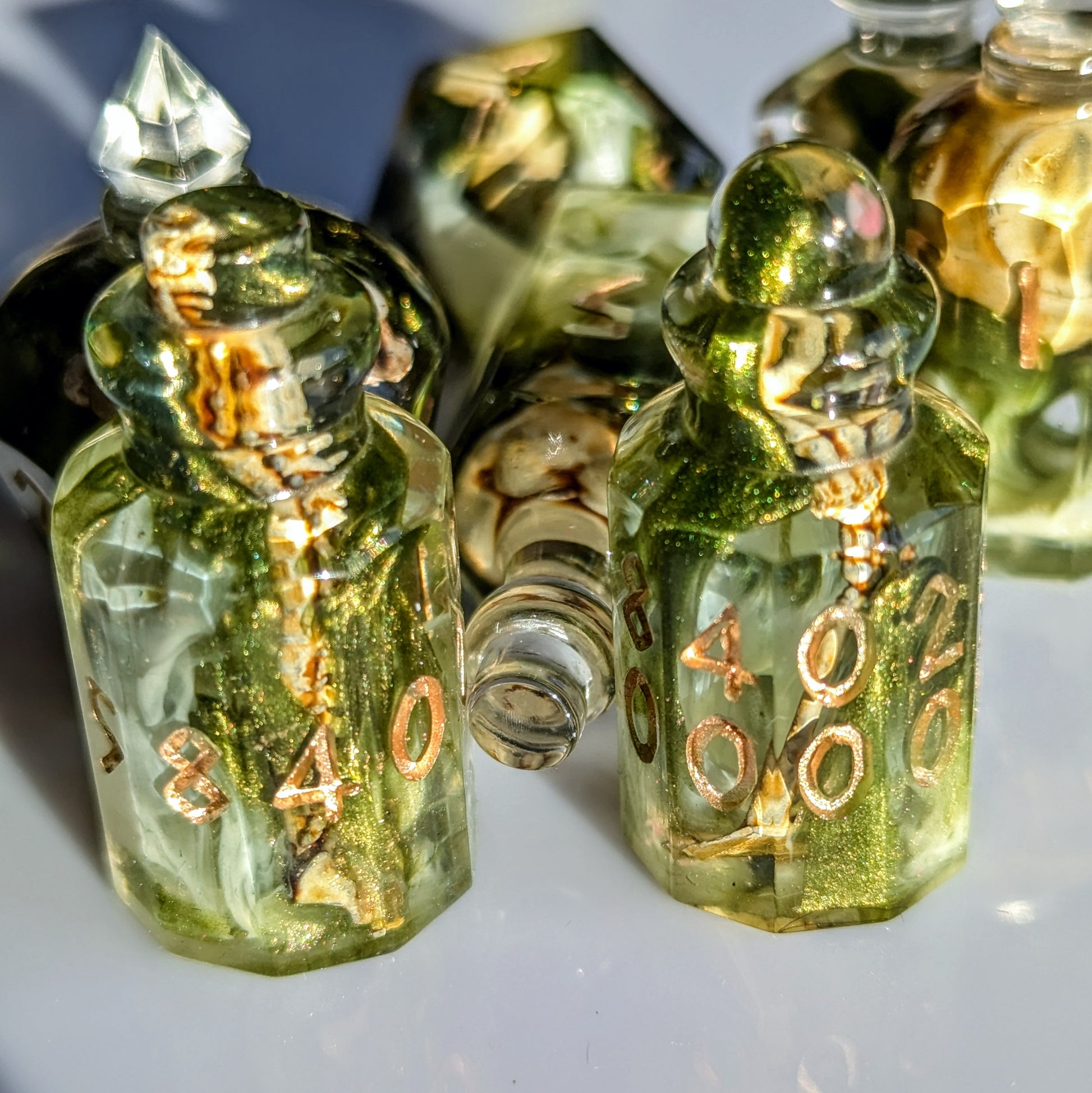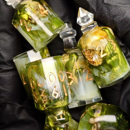 Green resin with shimmery green and white bloops surround printed and painted bones in this set of bottle shaped dice.
